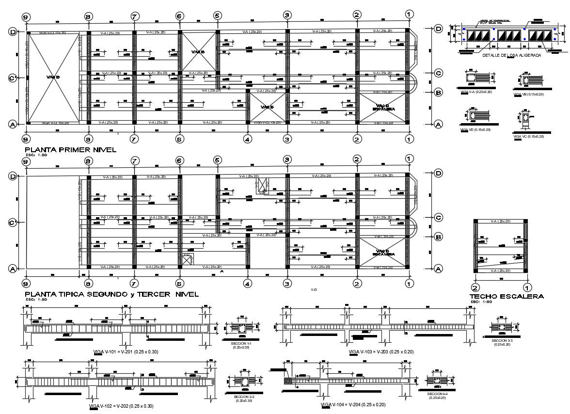 2d design of column beam structural CAD blocks which also includes reinforcement details in tension and compression zone, column spacing details, main and distribution hook up and bent up bars details, etc.