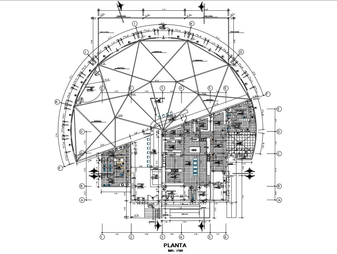 2d design plan of restaurant which includes work plan design of building along with furniture blocks details, dimension hidden line details, section line detail, dining area and kitchen area details, etc.