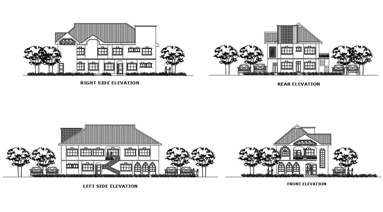 Bungalow elevation drawing which includes house different sides of elevation like front elevation, sides elevation and rear elevation along with house floor level details.