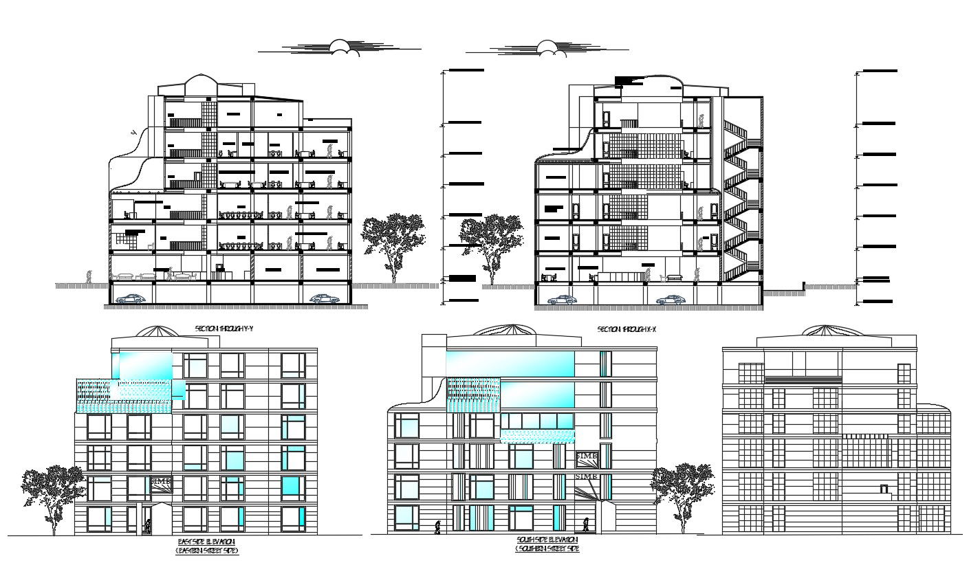 2d design elevation and sectional drawing of banking hub which shows building different sides of elevation like front elevation, side elevation and rear elevation along with floor level details.