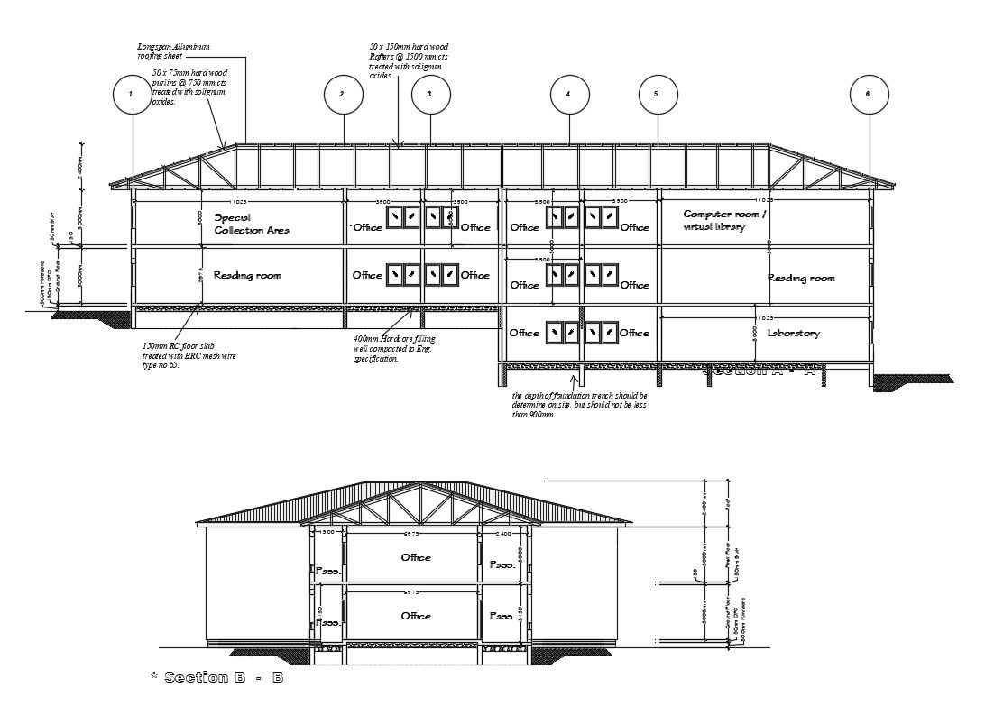 CAD sectional drawing of library building along with floor level details, roofing structure details at the ceiling, etc.