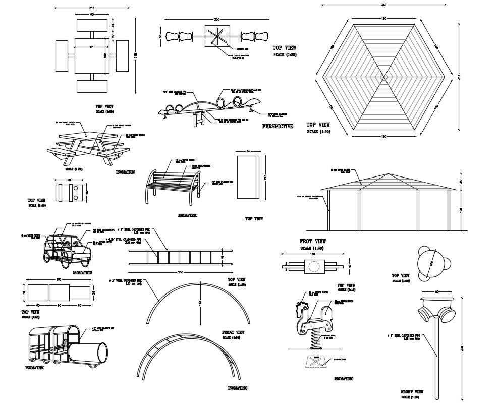 Gazebo design with other garden playing equipment along with the garden bench, see-saw details, ladder, and other units details.,