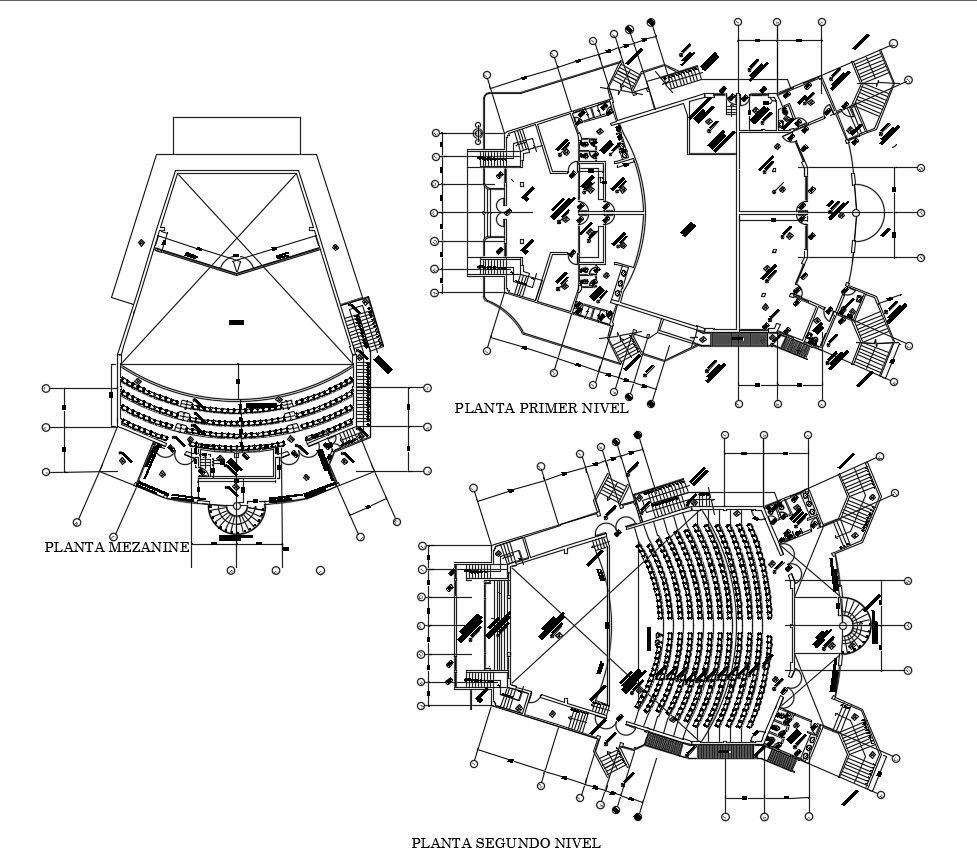 Auditorium building design CAD plan which shows work design p[lan of building along with seating arrangement details and building dimension hidden line details.