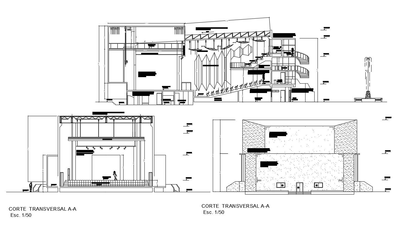 2d Drawing of auditorium section CAD file which shows building different section drawing along with floor level details and seating arrangement, auditorium stage design details, etc.