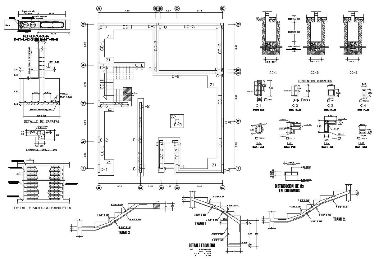 2d drawing of various RCC str5ucturtal blocks which shows staircase details, column foundation plan details, footing structure details, etc. Construction details of RCC structure are presented in this CAD drawing.