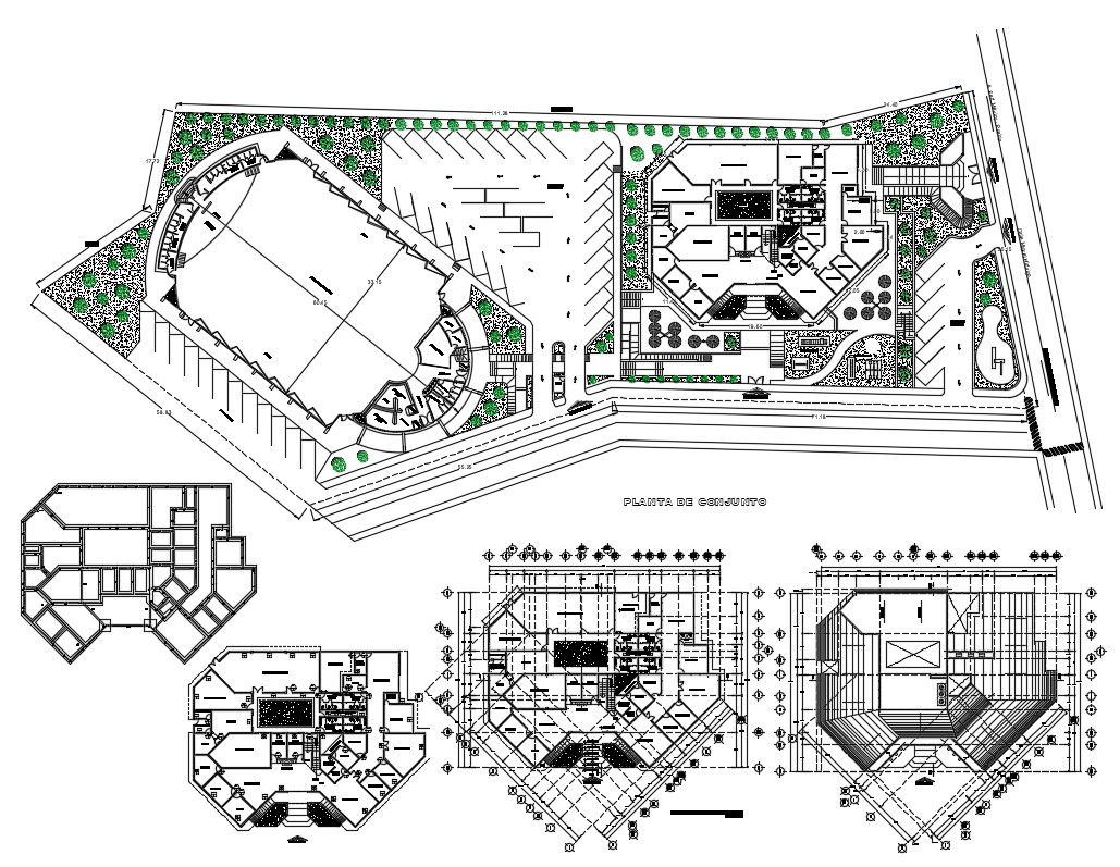 2d floor plan design of education building center which includes floor level details, dimension hidden line details, section line details, room dimension details, parking space details, etc.