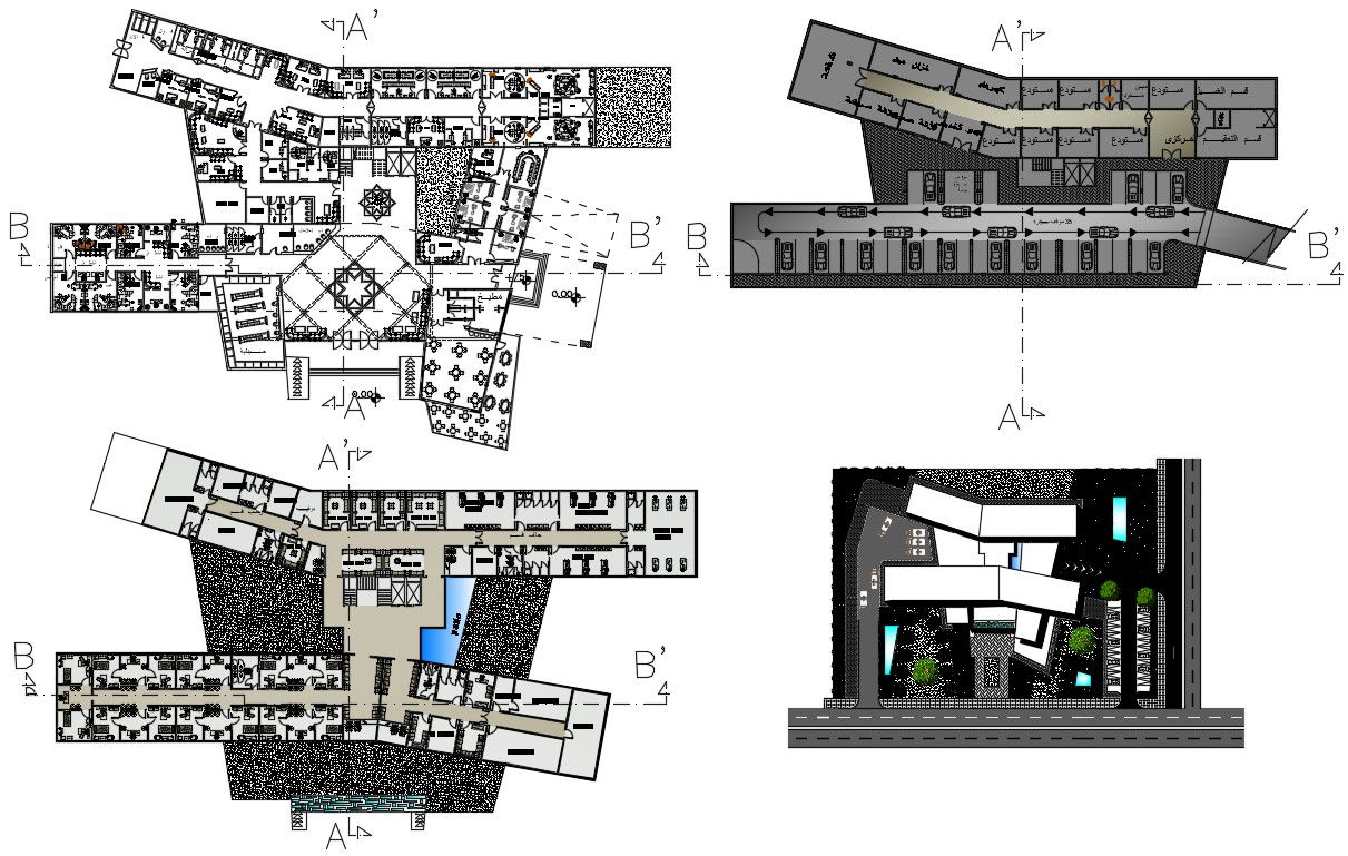 2d floor plan of hospital building which shows furniture layout design in building along with waiting area details, pantry area details, specifical wards details, general ward details, floor level detail, ICU room details, OT room details, medical store details, and many other units details.