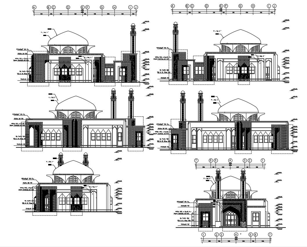 2d elevation design of mosque which shows mosque different sides of elevation along with sectional details of mosque and dome design details.