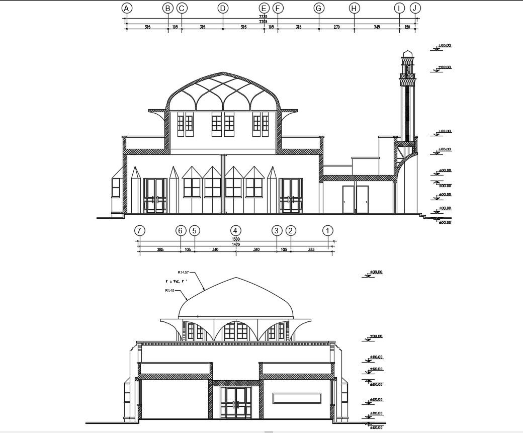 2d drawing elevation of the masjid which shows masjid details elevation drawing along with dome design and leveling details.