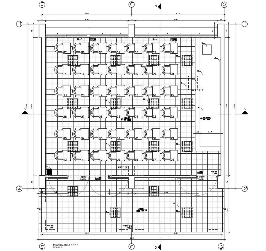 2d design plan of the classroom which shows furniture blocks of student chair in classroom along with dimension section line and hidden line details.