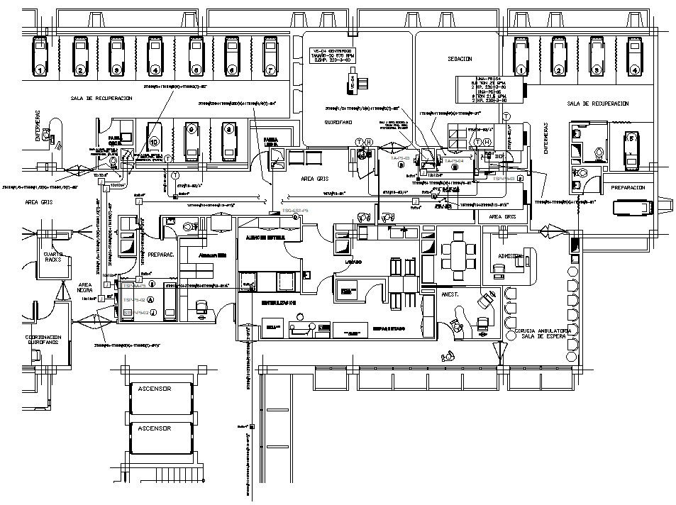 Hospital Layout Plan DWG File; 2d CAD drawing of hospital project includes general admin room, special room, reception with waiting area, and pharmacy store with furniture detail.