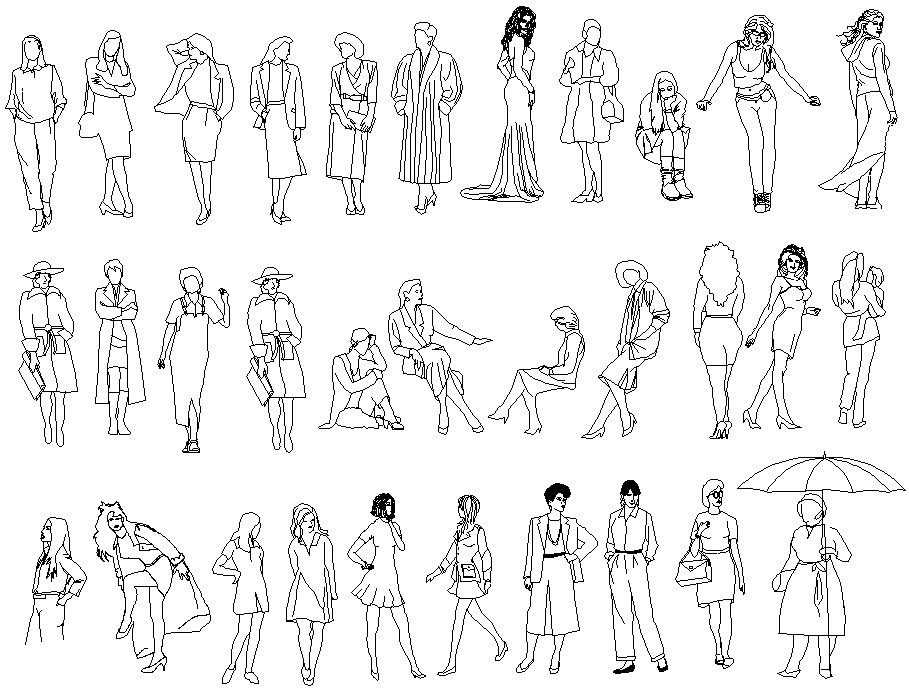 Women CAD blocks Download AutoCAD File; people CAD blocks drawings in AutoCAD file This DWG file contains are woman standing, woman model view, women's front view, women with head cap, women with umbrella, girl with bag.