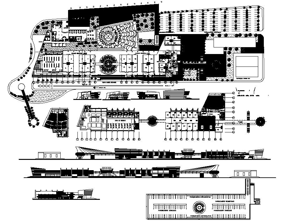 City Central Mall Plan AutoCAD file; 2d CAD drawing of top view includes restaurant, shops, auditorium, and office with furniture plan along with elevation design of city central mall building.