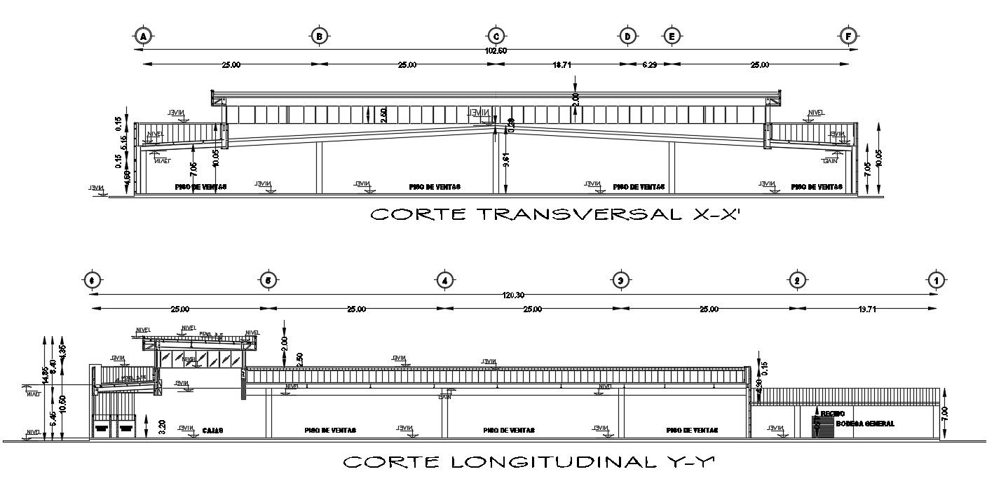 Sectional drawing of the store design CAD file which shows the two-way slab details along with column supporters details and level details.