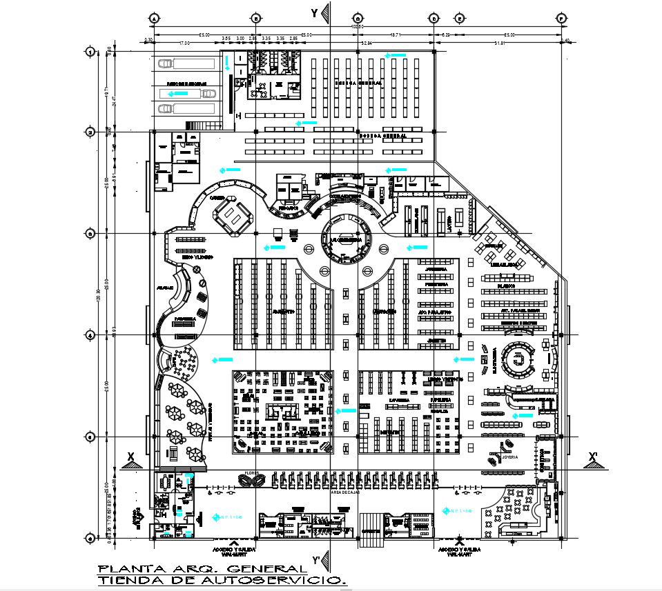 CAD design plan of auto service store which shows floor plan of building along with section line and dimension details, hidden line details, and many other details.