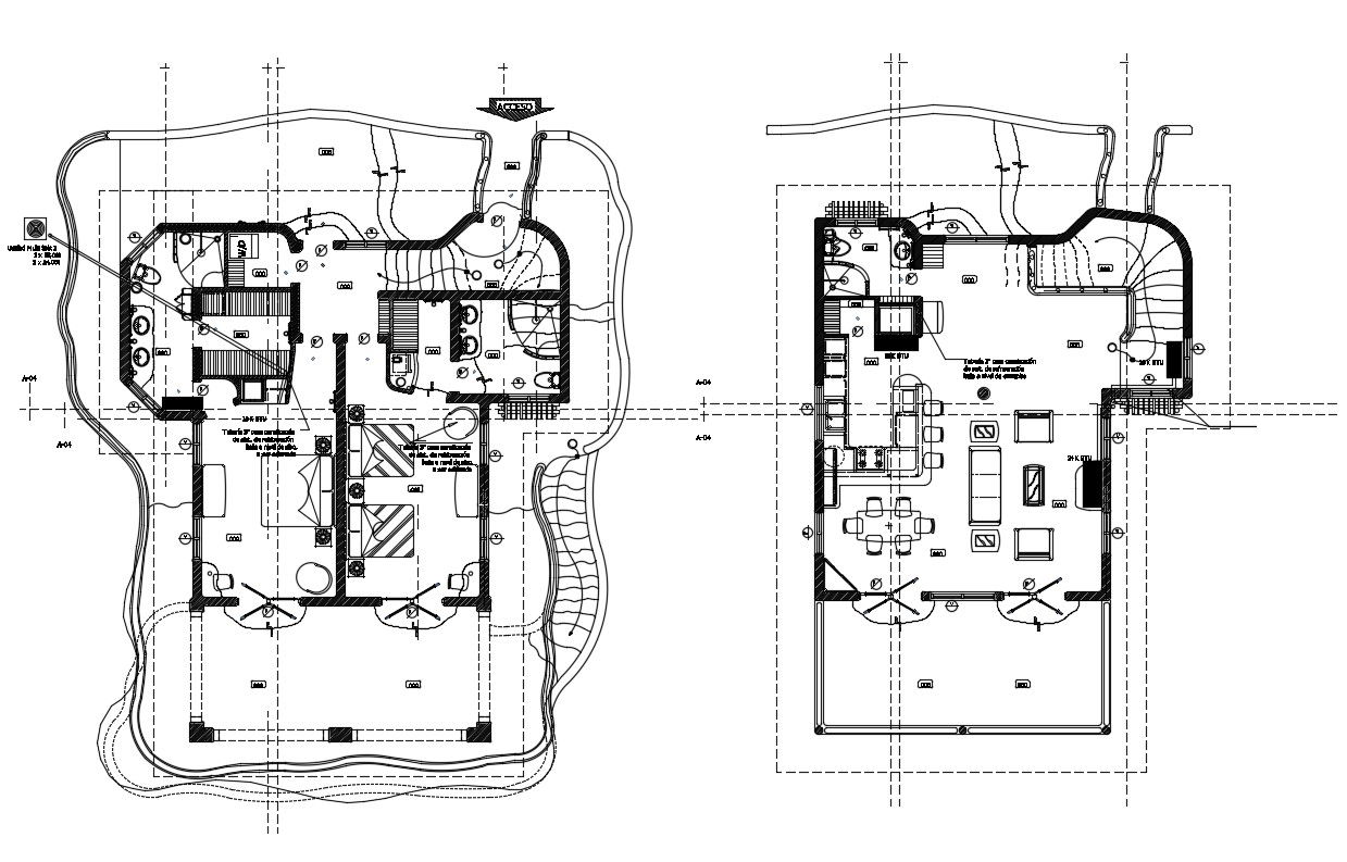 Furnished house design plan which shows work plan of the house along with floor level details and room details includes details of the drawing-room, bedroom, kitchen and dining area, sanitary toilet and bathroom details, and many other units details.