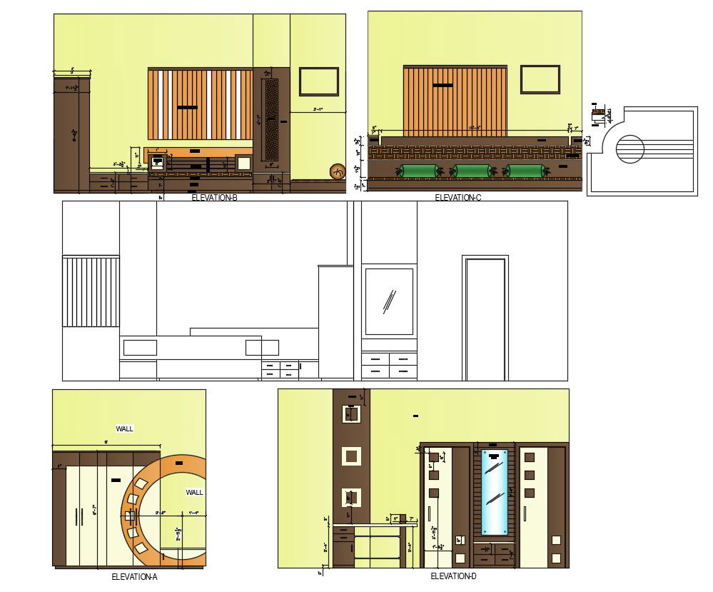 CAD drawing of bedroom elevation which shows furniture blocks design in bedroom of bed, wardrobe, study table and chair, and various other unit details.