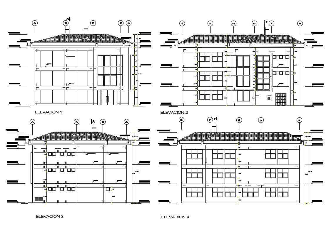 2d drawing details of university building elevation like front elevation, side elevation and rear elevation along with building floor level details.