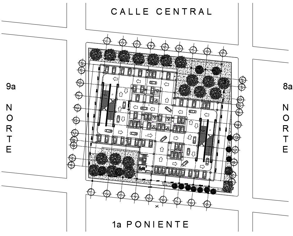 2d design plan of the car parking area along with 90-degree parking system details and ramp design details, dimension hidden line details, open space details, and other unit details also included in the drawing.
