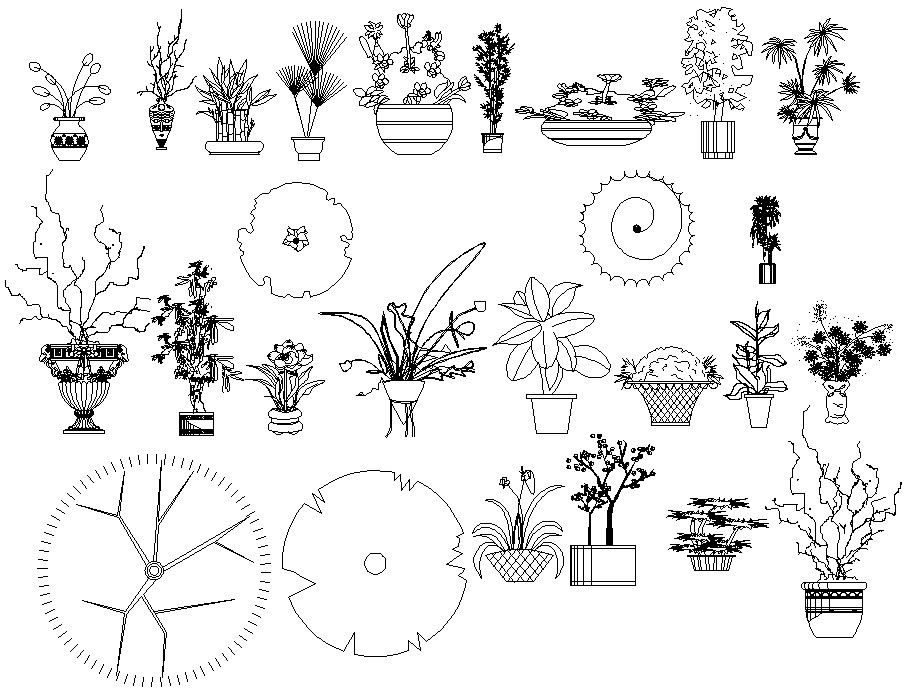 Potted Plant CAD Blocks DWG file; download free Potted Plant CAD Blocks and use for indoor landscaping.