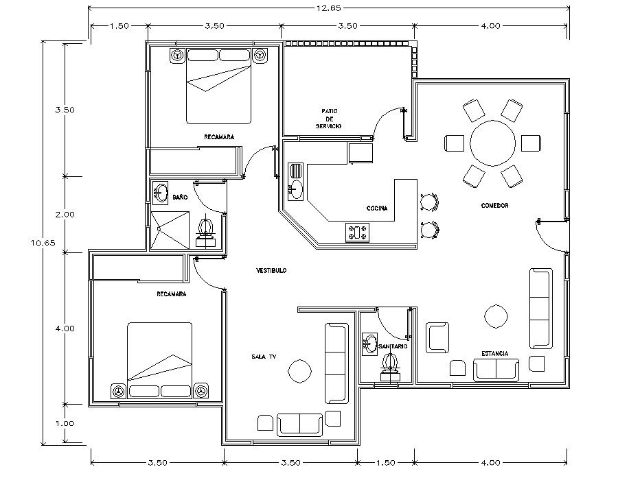 2 BHK House Plan DWG File; Architecture house layout plan with dimension and furniture details. download the house DWG file and apply this drawing in your house project.