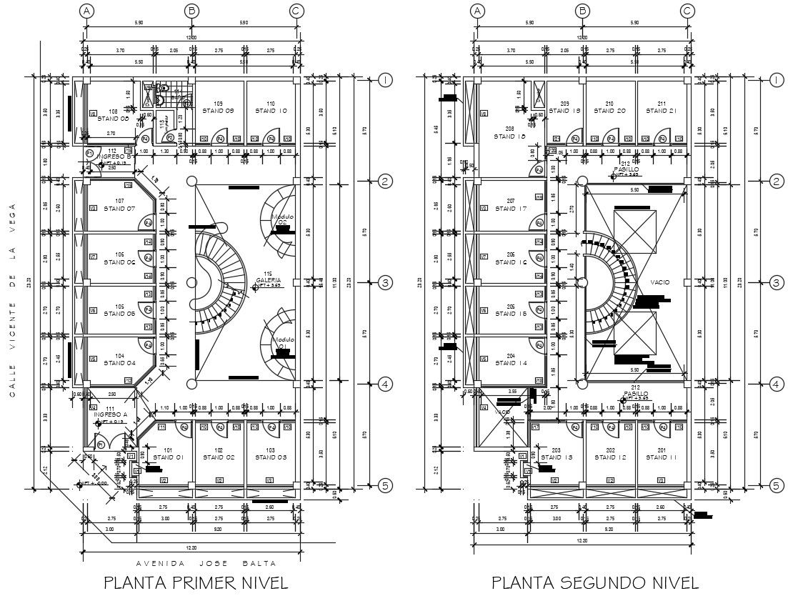 2d CAD plan drawing details of shopping center building which includes floor level details along with dimension hidden line details. building shops details, staircase details, passage area details, and various other unit details also included in the drawing.