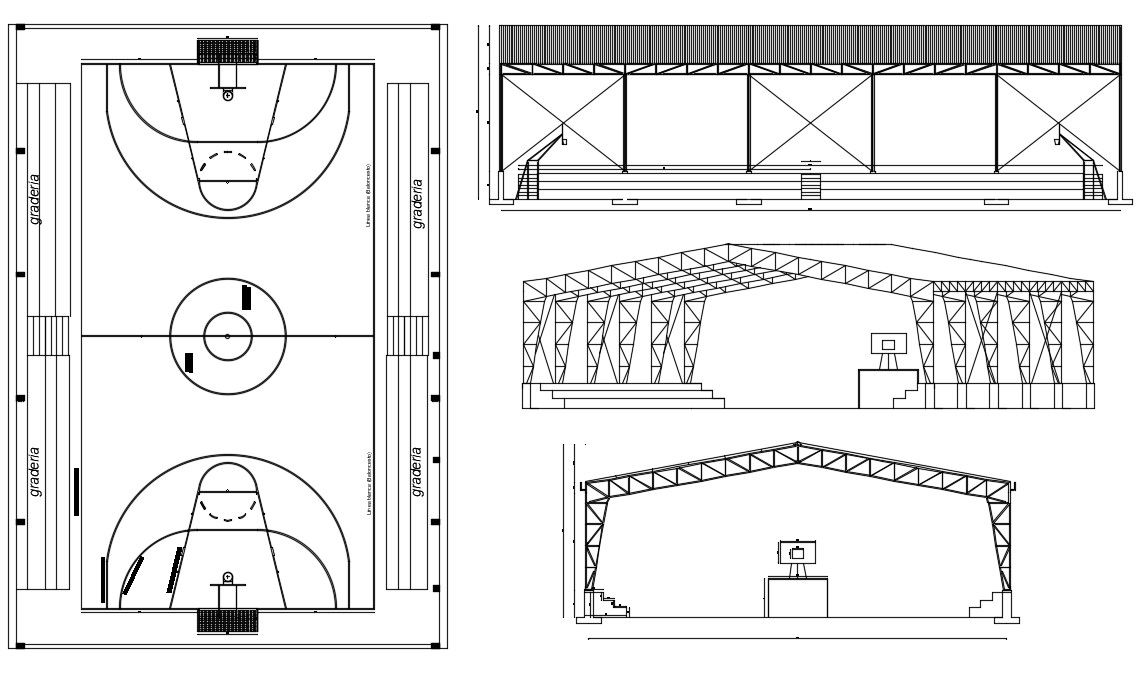Design plan and elevation drawing of basketball court ground which shows basketball net details along with ground markings and signs details.