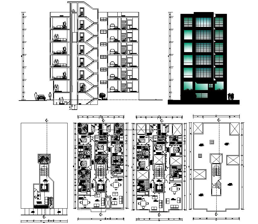 Apartment Building Project Plan DWG File; the architecture apartment project AutoCAD file includes floor plan with furniture detail, section plan, and elevation design.