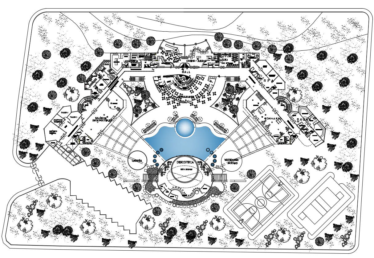 CAD plan of the hotel which shows the work plan design of hotel building along with floor level details, furniture layout design in building, ground area details, and various other unit details.