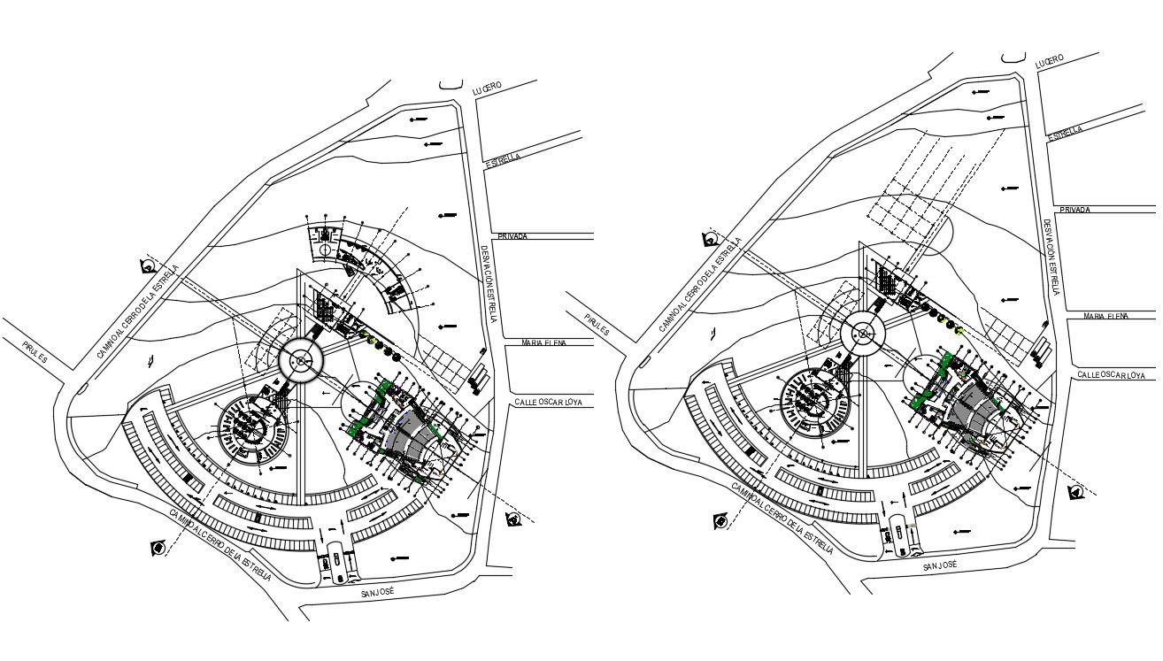 Cultural center building area planning drawing which shows building plan details along with road network details and dimension details, section line details, parking space area details, and various other unit details.