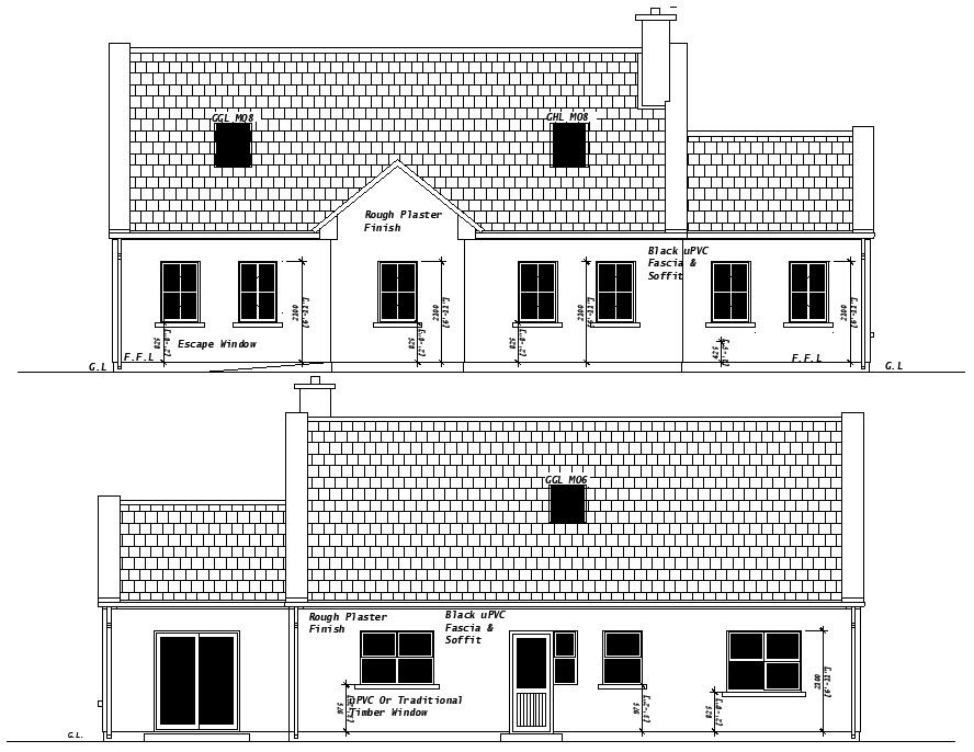 House Elevation Design DWG File; download AutoCAD file of house elevation design with dimension details and truss roof design.