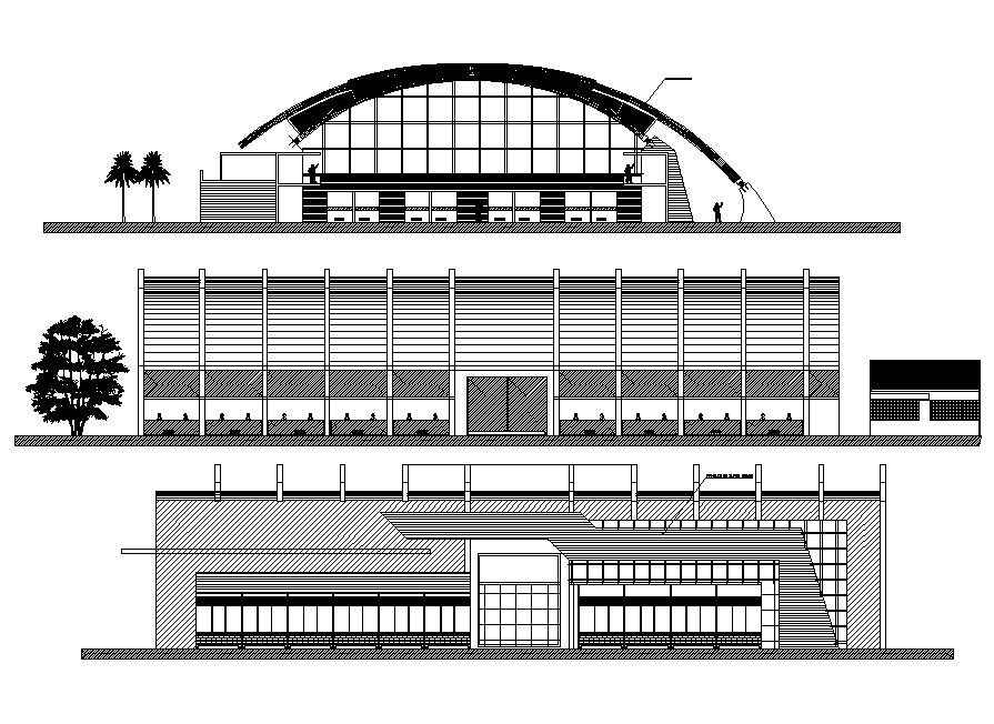 Shopping Mall Elevation Design DWG File; 2d CAD drawing of shopping mall building elevation design with arch structures top view.