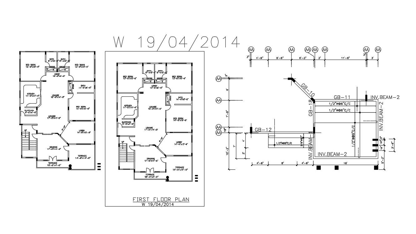 Floor layout plan of residence house which shows the work plan of house along with room dimension details. Floor level details with room details of the drawing-room, bedroom, kitchen and dining area, sanitary toilet and bathroom area, details also included in the drawing.