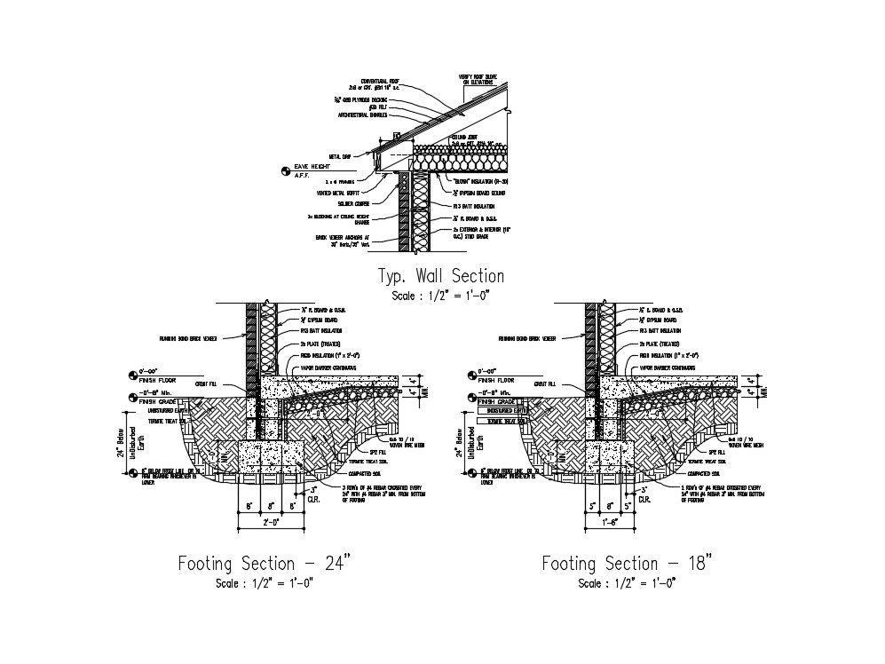 CAD construction details of RCC structural blocks which show the typical wall section detailed drawing along with wall footing details, Reinforcement detailing, DPC details, concrete masonry works details, ground-level details, and various other components details also included in the drawing.