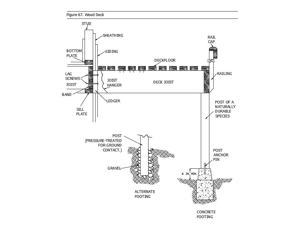 Wooden deck design CAD drawing which shows the joints and connections details in the deck along with deck joist, sheating details, concrete footing details., screw and bolts details, and many other components details.