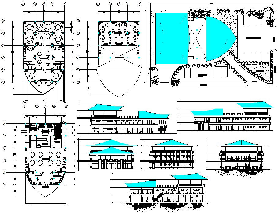 Restaurant Project Plan DWG File; the architecture ground floor plan and first floor with furniture detail, section plan and elevation design of restaurant project. download AutoCAD file and use it for your restaurant CAD presentation.