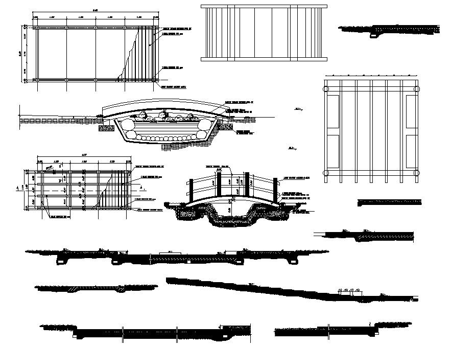 Wooden Garden Bridge DWG File; top view and side section plan of Wooden Garden Bridge with footing structure and beam section details. download AutoCAD file and get more detail about garden shrubs design.