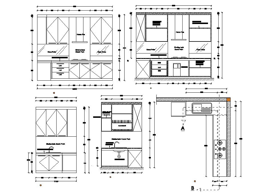 Kitchen Interior Design DWG File; layout plan and elevation design shows hanging cupboard, gas stove, drawer, sink and chimney with dimension detail of kitchen interior design.