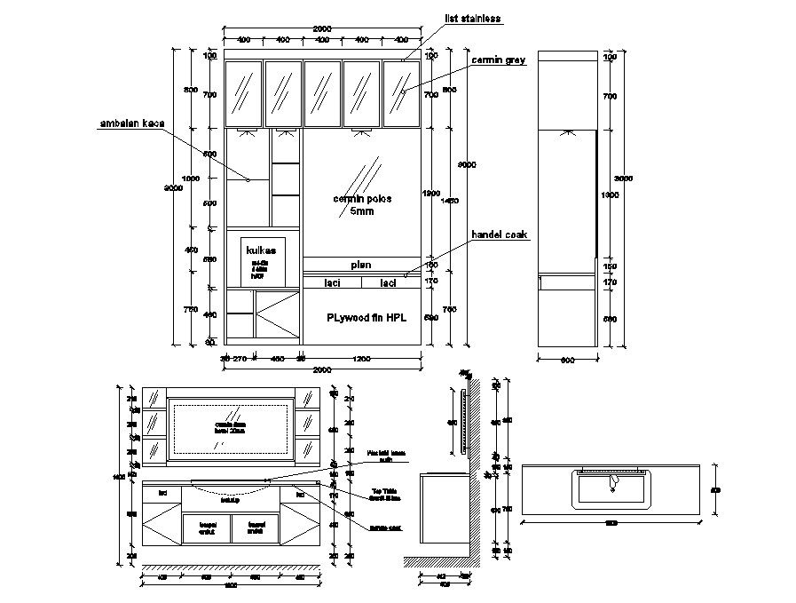 Dressing Cupboard CAD Drawing; basin cabinet and dressing cupboard with mirror furniture design. download DWG file of dressing furniture design with dimension details.