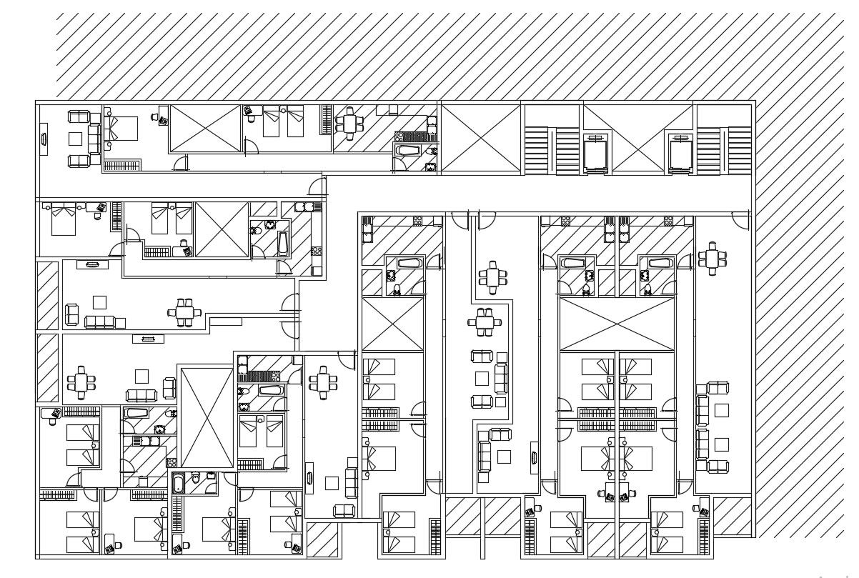 design plan of residence attached house which shows the furniture layout details in building along with room details of the drawing-room, bedroom, kitchen and dining area, sanitary toilet and bathroom in the house.