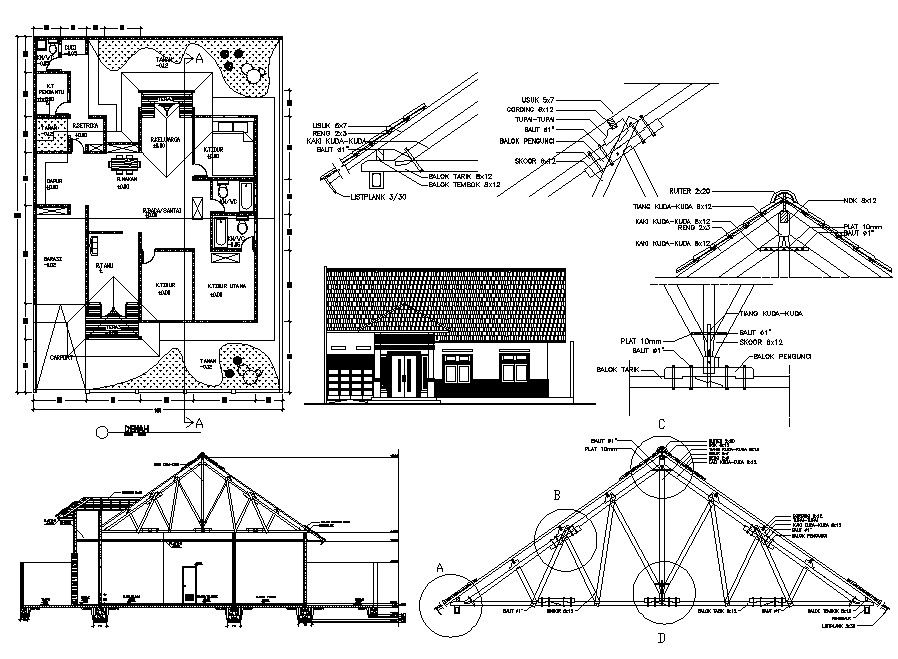 Truss Roof House AutoCAD File; 2d CAD drawing shows a residential house plan furniture detail with wood roof truss details, it provides a basic understanding of wood trusses. also have a section plan and elevation design of the house project.