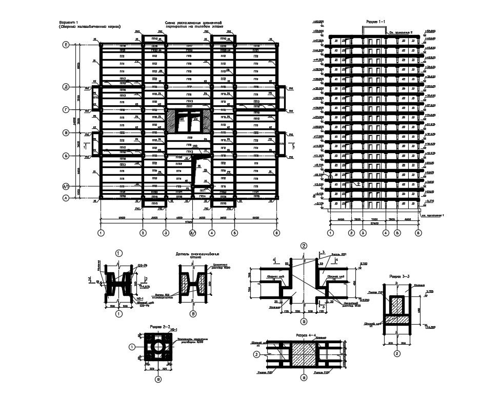 2d sectional design of high rise building along with floor level details, building dimension details and various other blocks details.