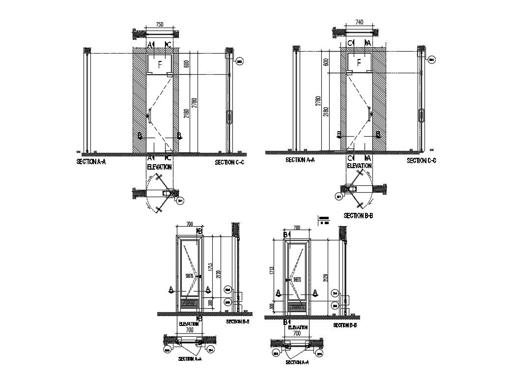 2d drawing glass door plan and elevation CAD drawing which also shows the door height and width details along with door turning radius details and other units details.