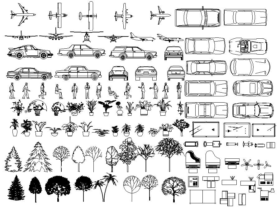 2d Miscellaneous CAD Blocks DWG file; AutoCAD blocks includes musician instrument, GYM, aircraft and car, tree and plant, and, people elevation CAD blocks. download CAD blocks and use them to improve the AutoCAD presentation.