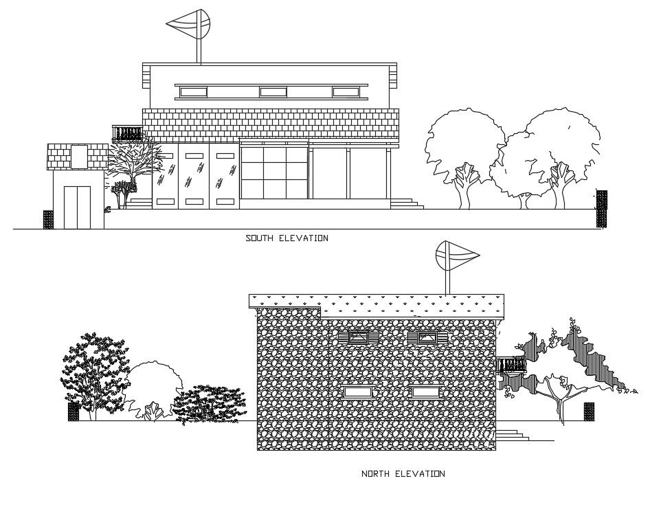 Residence Building Elevation Design DWG File; 2d cad drawing of residence house elevation design includes outside wall design, slider glass window view, terrace detail and use tree blocks for improving cad presentation.