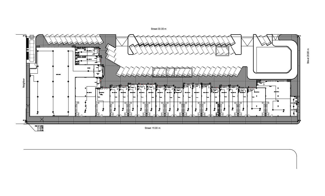 Layout plan design of building hu8b which shows the work plan design of building along with compound boundary wall details, 30 degree, and 60-degree parking system details.