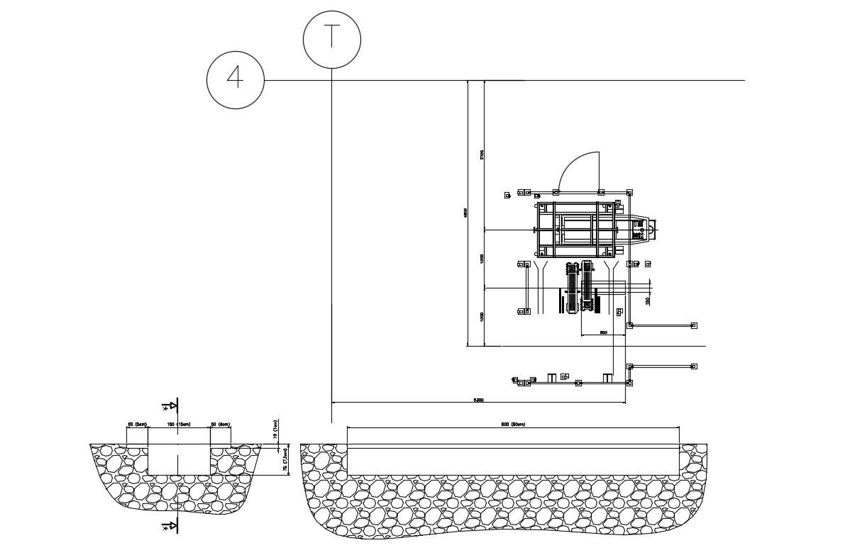 Details design of machinery room 2d view which shows machine room plan details along with machinery CAD blocks details.