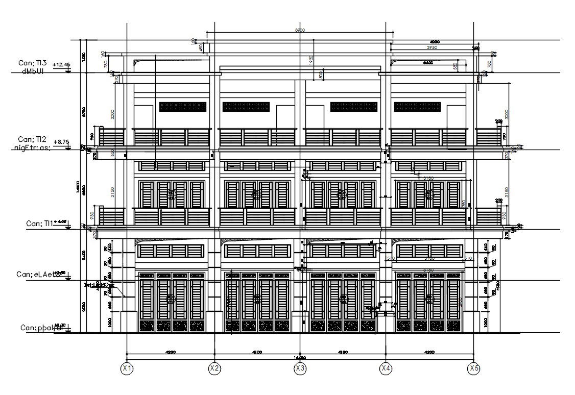 Row House Elevation AutoCAD file; 2d cad drawing of row house front elevation design showing that door and window with balcony detail, and all dimension mansion in cad file. download AutoCAD file and get more detail about row house project.