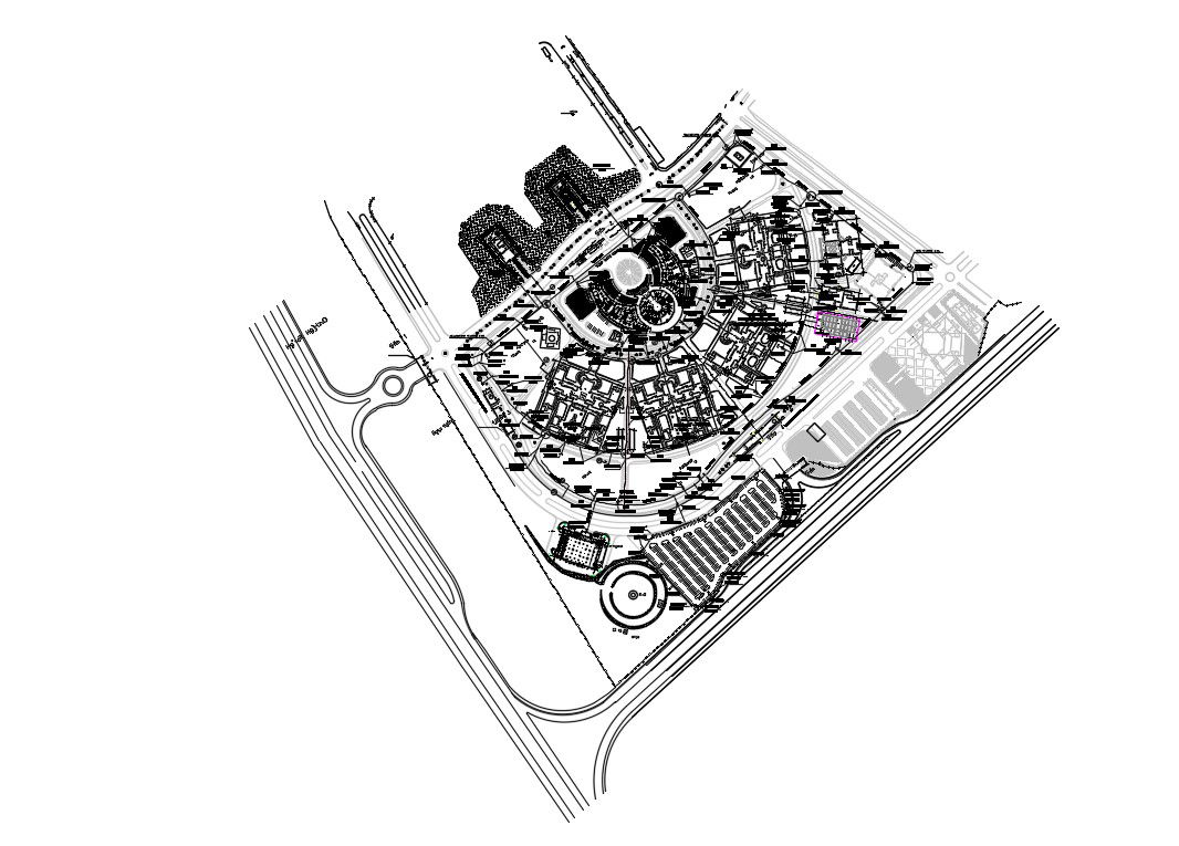 Commercial building designing CAD layout plan which shows the building floor plan details along with floor leveling details, nearby road network details, parking space details, landscaping details, and various other unit details.