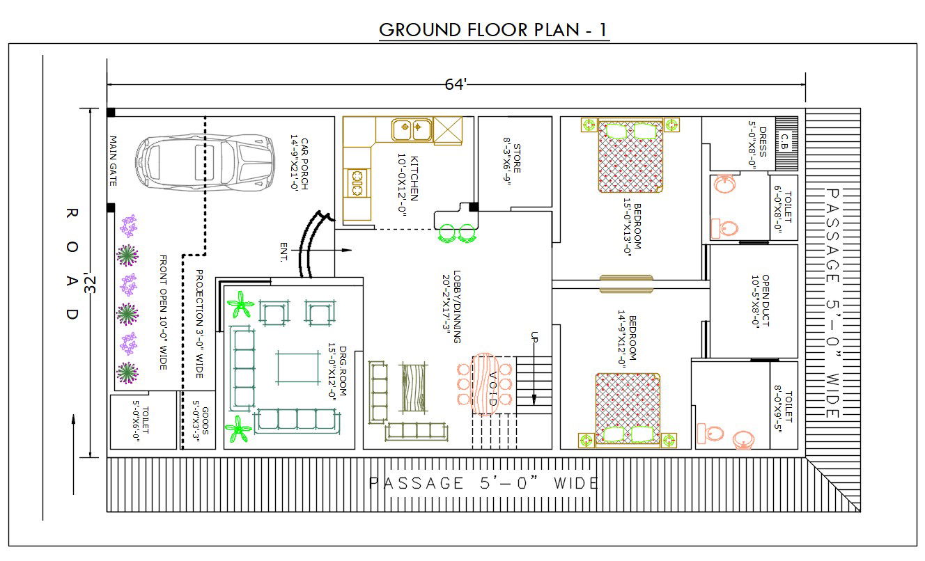 32 X 64 House Floor Plan DWG File; ground floor plan 32x64 size in feet very good planning for residential plots.